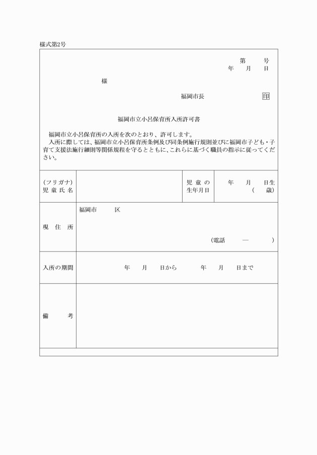 2 市長は、入所許可をしたときは、福岡市立小呂保育所入所許可書(様式第2号)を交付するものとする。