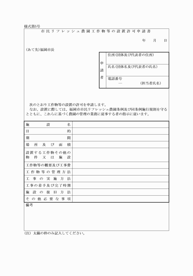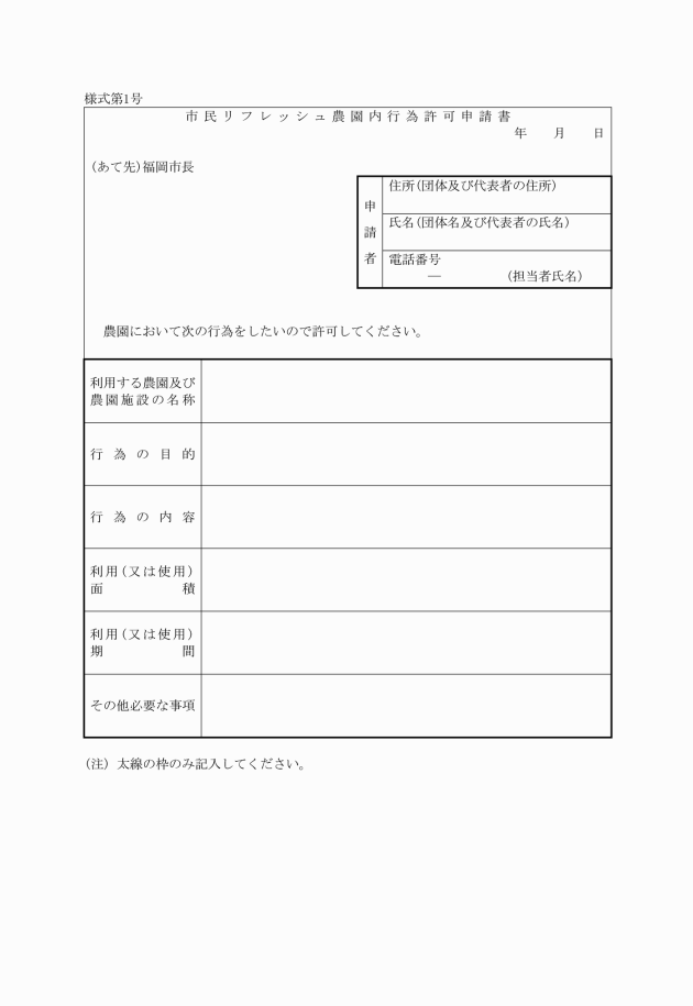 第2条の2 条例第4条の2第2項及び第3項の申請書の様式は、市民リフレッシュ農園内行為許可申請書(様式第1号)による。