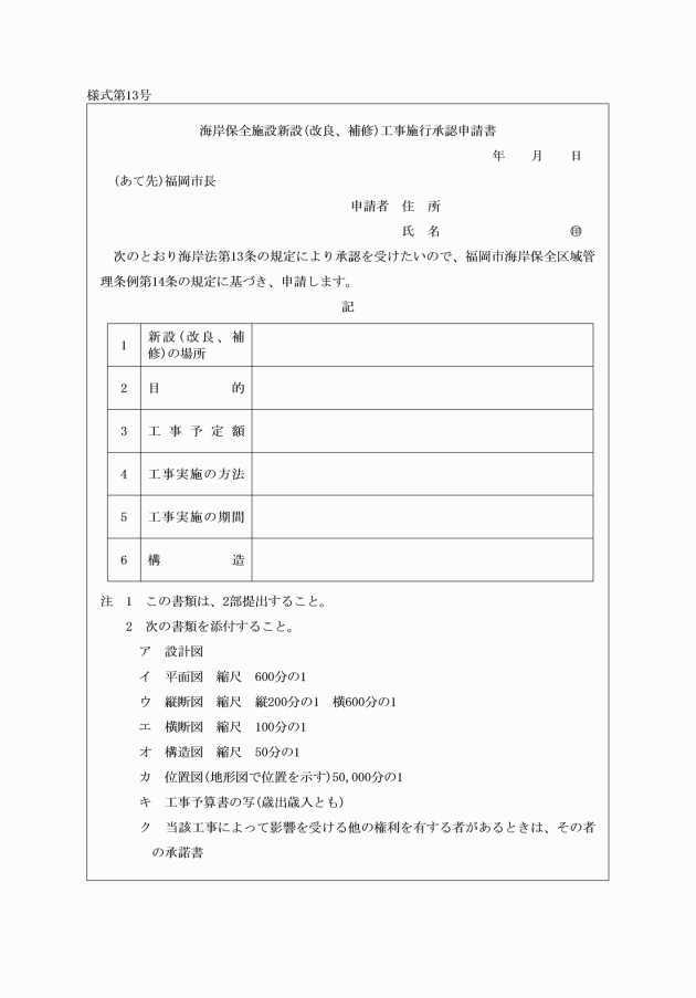 第8条 条例第14条の規定により承認の申請をしようとする者は、海岸保全施設新設(改良、補修)工事施行承認申請書(様式第13号)を市長に提出しなければならない。