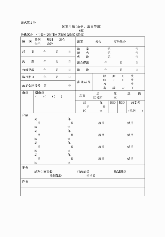 (1) 議案、議会提出文書、専決処分書、規則及び訓令については、総務企画局行政部法制課にその起案文書を送付すること。