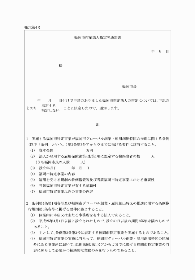 3 市長は、申請があったときは、その内容を審査し、申請書を受理した日から原則として1月以内に、その結果を福岡市指定法人指定等通知書(様式第4号)により当該申請を行った法人に通知するものとする。