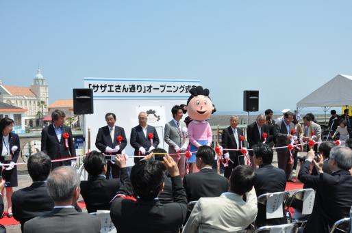 故長谷川町子さんの人気漫画「サザエさん」の発案の地として、西新から百道浜地区の市道に「サザエさん通り」が誕生し、その記念式典と誕生パレードが5月27日にありました。