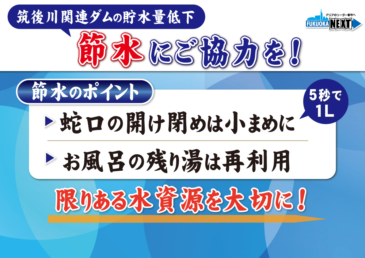 筑後川からの恩恵を受けている福岡市では、限りある水を無駄にしない取り組みを進めていきますので、ぜひ市民の皆さん、これは同じく福岡都市圏の皆さんですね、そうした皆さんにもですね、このような状況をご理解いただいて、お風呂の残りを洗濯や散水に利用したり、また、食器洗いや歯磨きのときなど、蛇口はこまめに開け閉めをするなど、それぞれできるかたちで引き続き節水へのご協力をよろしくお願いをいたします。
