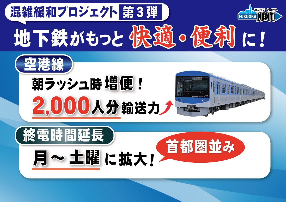 一つ目は、空港線の朝ラッシュ時の増便。これ、混雑緩和プロジェクトは、今年からいろいろと紹介をしているわけですけれども、これまで七隈線についての増便行ってきましたけれども、空港線についても朝のラッシュ時に増便をして、朝の通勤時間帯としては2,000人分の輸送力を向上させていきたい。これによって、より快適に乗っていただけるんじゃないかと考えてございます。