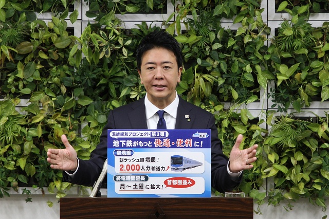 やっぱり間隔をできるだけ早く、次の電車、次の電車というふうにしたいんですけども、当然、これ七隈線も一緒ですけれども、車両の台数が増えないとそれもできないわけであって、今、新しい車両というのもつくっておりまして、こういったものを投入していきながら、できるだけより福岡については、今朝もね、なんか発表されていましたけど、人口が福岡市については増えるエリアですので、しっかりこうした利用者が今後増えてきてもできるようにですね、新車両を新しくつくったり、それから、今、七隈について言うと150%輸送力を上げるために、今、ホームを全部広くしてですね、4両を6両にしたいというようなことも検討しておりますので、こういう様々な対応を取りながら、しっかり都市基盤を支えていきたいと思います。
