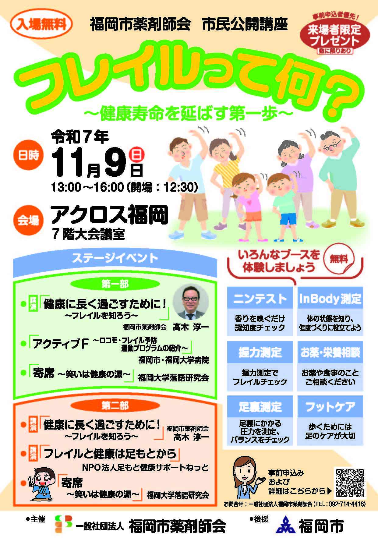 笑いと学びを通して、健康寿命を延ばす第一歩を薬剤師と一緒に踏み出しましょう。フレイル予防の専門的な話から、今の身体の状態をチェックし、健康な身体を作るための簡単な体操や栄養のアドバイス、さらには落語まで、盛りだくさんの内容でお届けします。健康寿命を延ばすためのヒントを見つけに来ませんか?