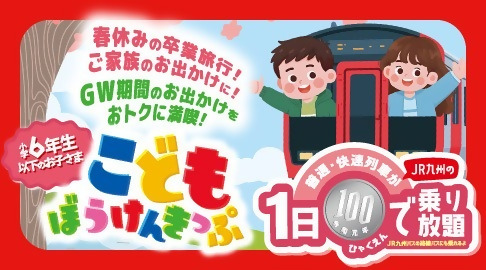 JR九州では、2026年3月14日(土曜日)~2026年3月31日(火曜日)に、小学生以下のお子さまが100円でJR九州の普通・快速列車、JR九州バスの路線バスが1日乗り放題になる「こどもぼうけんきっぷ」を販売中です。春休みも便利でおトクな「こどもぼうけんきっぷ」をぜひご利用ください!