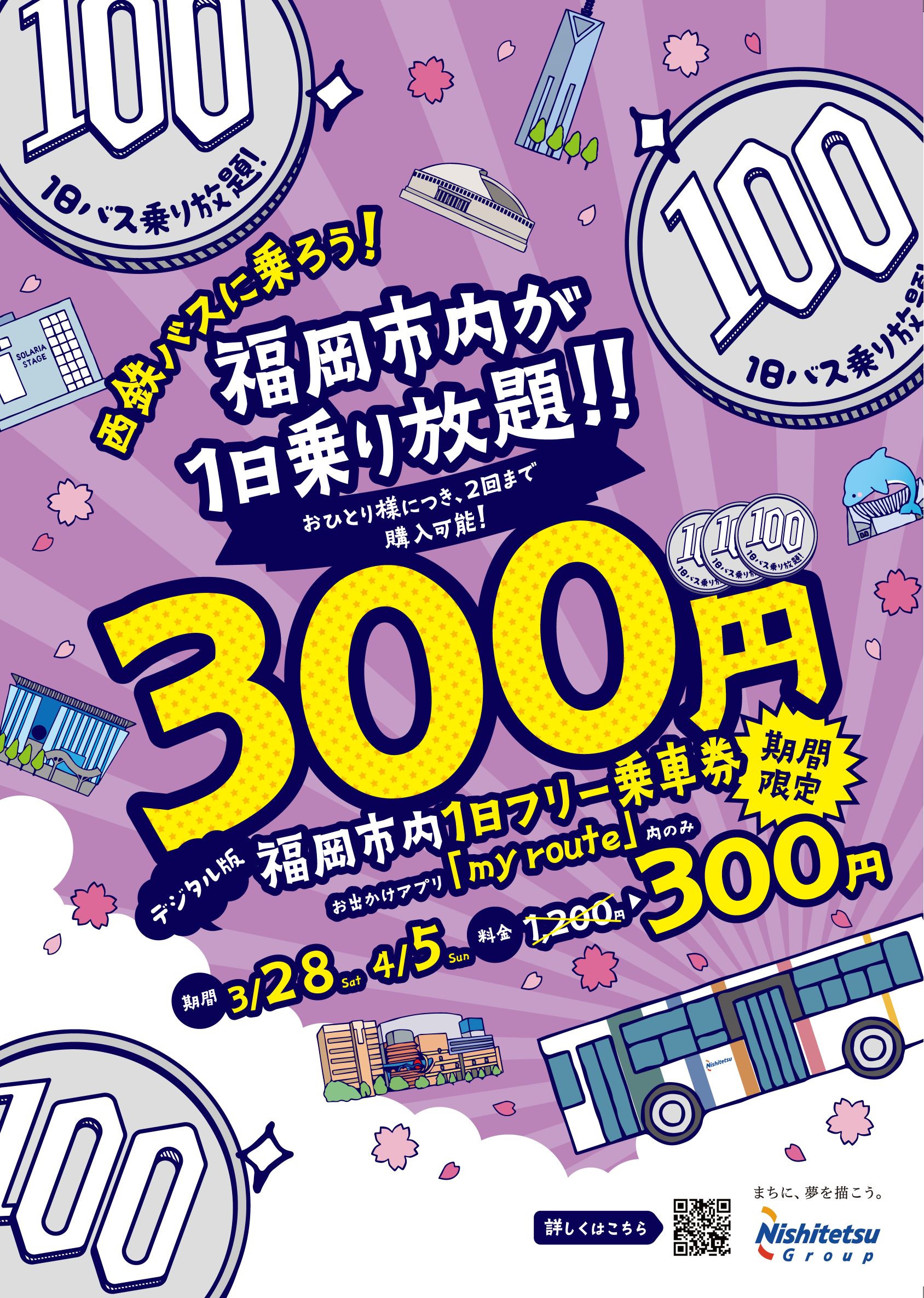 西鉄バスでは、「新生活応援キャンペーン」として2026年3月28日(土曜日)~2026年4月5日(日曜日)に「西鉄バス 福岡市内1日フリー乗車券」が通常より約8割引きとなる300円で販売をいたします。