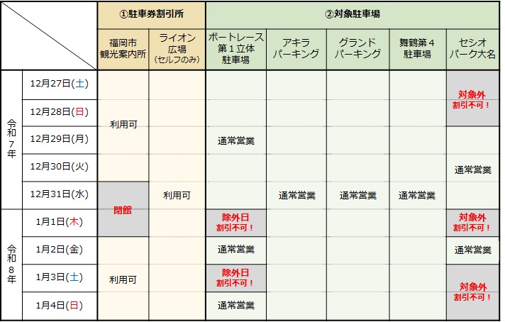 12月31日(火曜日)、1月1日(水曜日)は福岡市観光案内所が閉館するため、館内での割引処理とバス・地下鉄片道乗車券の配布は休止いたします。
