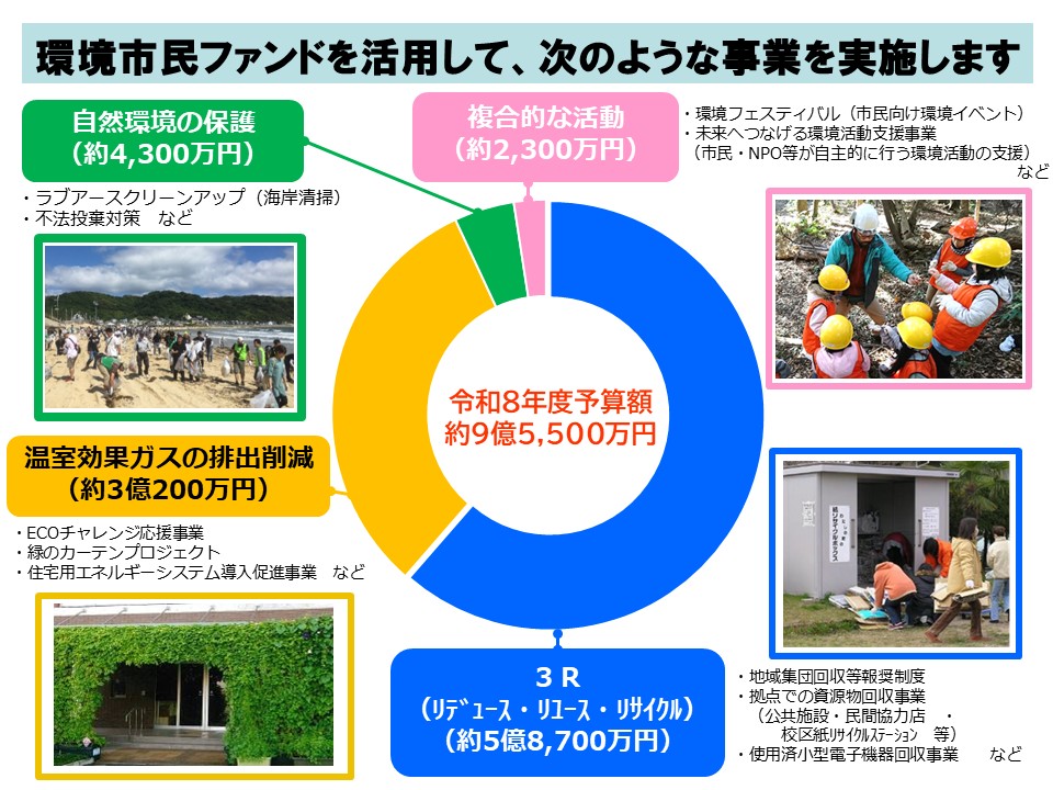 市民、企業、行政が協力して海岸等の清掃を行う「ラブアース・クリーンアップ事業」や市民団体等が企画・実施する環境保全活動を支援する「未来へつなげる環境活動支援事業」などに活用します。