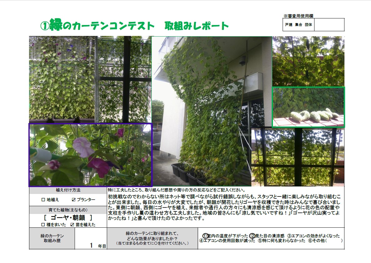 ご応募いただいた際の「緑のカーテンコンテスト 取組みレポート」を一つの作品と捉え、ご応募いただいたままの形で掲載しております。