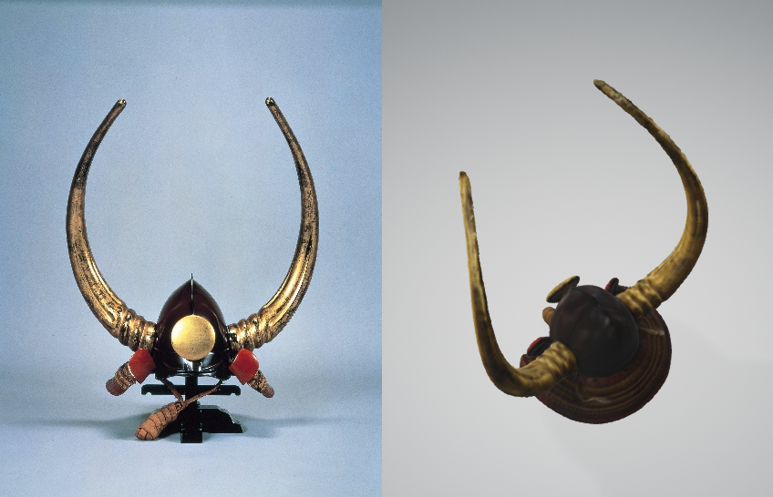 ※3D画像では,実際の資料とは異なり,真下からのぞくと,兜を置いている台や兜の緒が張りぼてのように見えています。