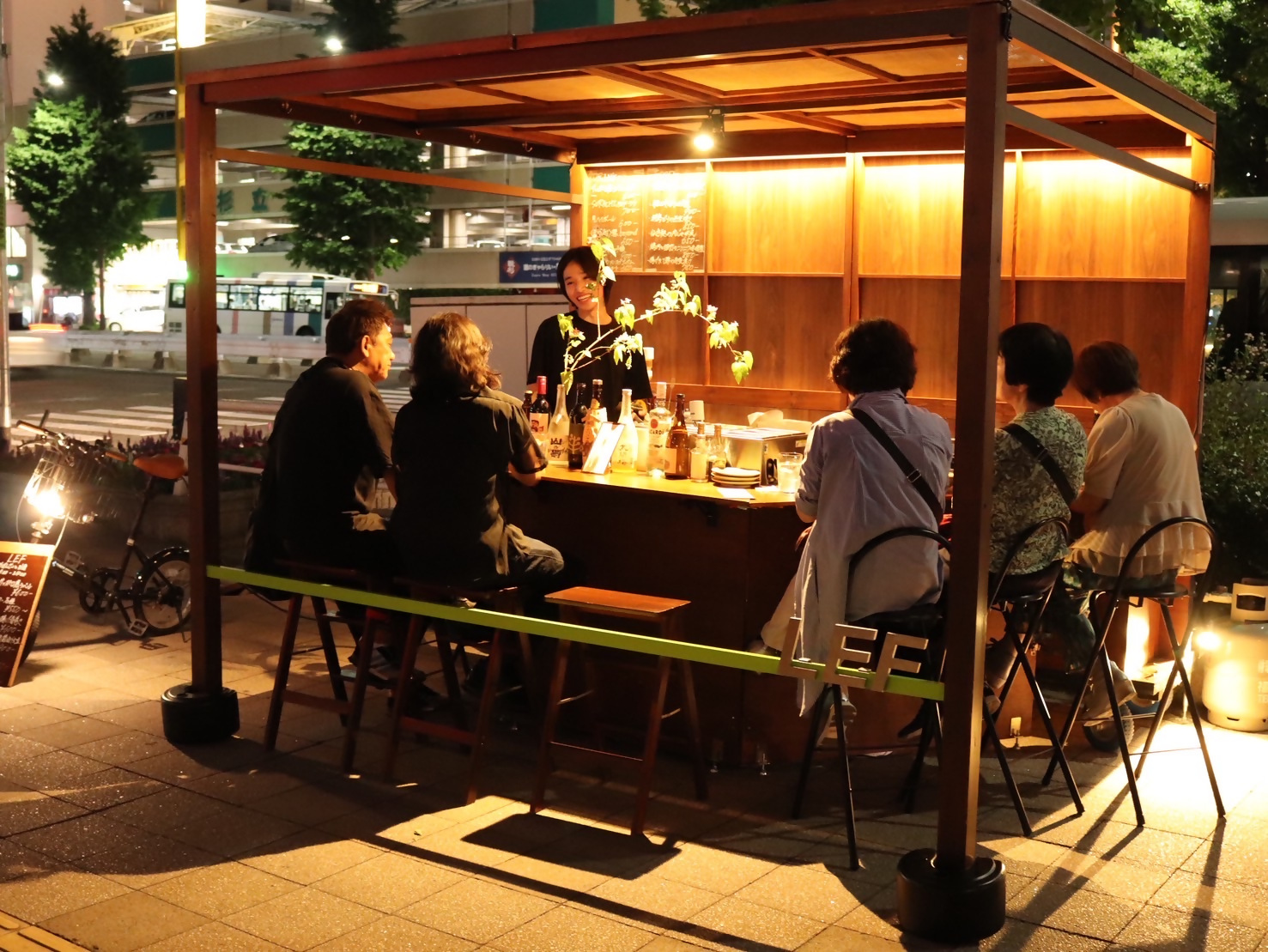 屋台の支える柱をあえて外側に配置することで、お客様同士が自然と会話が生まれやすくなるよう工夫しています。