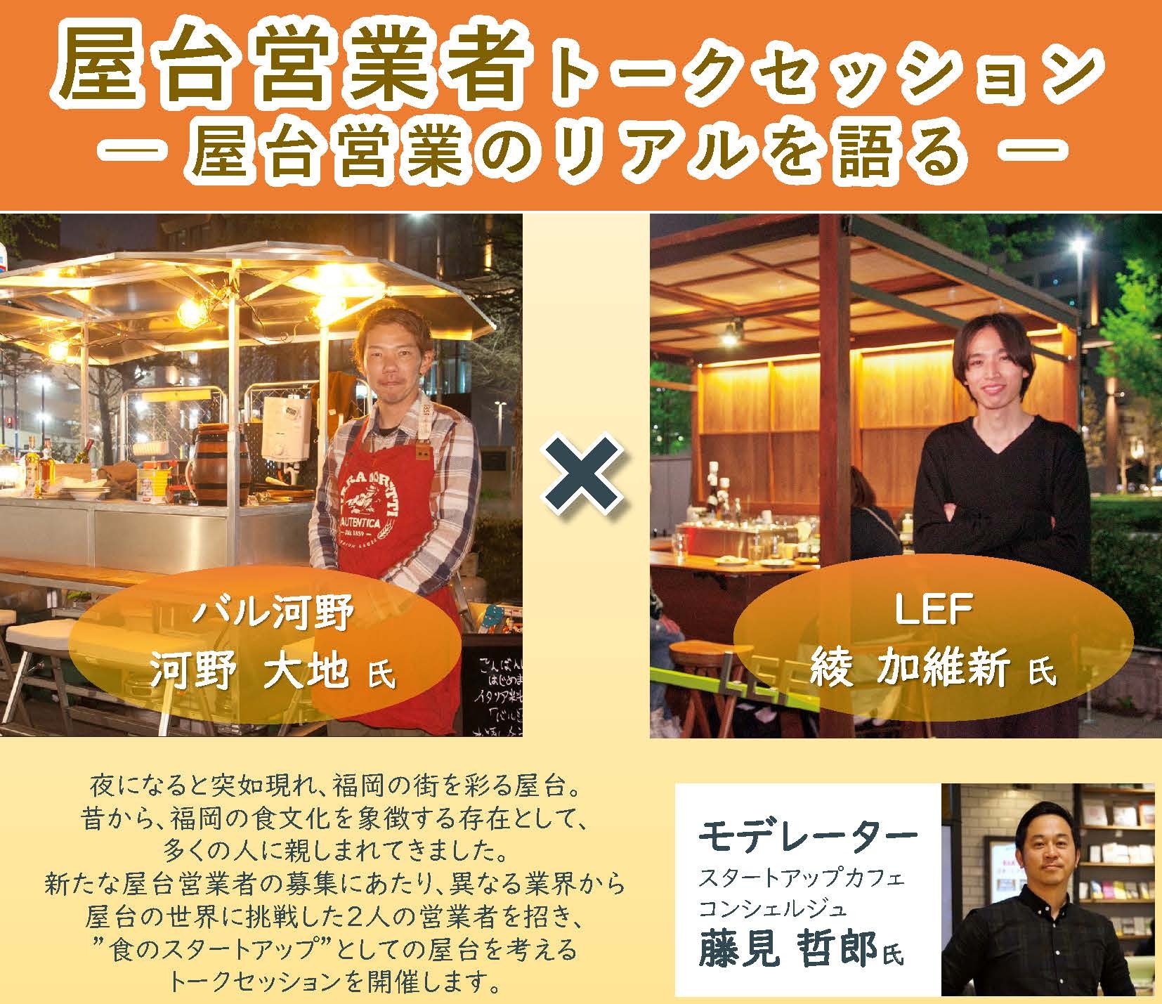 これから屋台営業を始めたい方や、屋台営業に関心のある方を対象に、公募により屋台を始めた営業者によるトークセッションを行います。屋台営業の魅力ややりがいに加え、開業準備や日々の営業での苦労、工夫など、実体験をご紹介します。