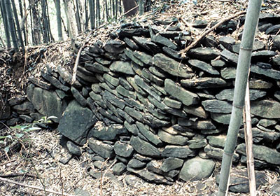 江戸時代、能古島は黒田藩の鹿の猟場で、最盛期には約600頭の鹿がいました。その鹿が田畑の作物を荒らすため、天保7(1836)年、東西2kmにわたる石垣が作られました。この石垣を鹿垣(ししがき)といい、高さは2m、その前面には幅3mの溝が掘られ、鹿の南下を防ぎました。