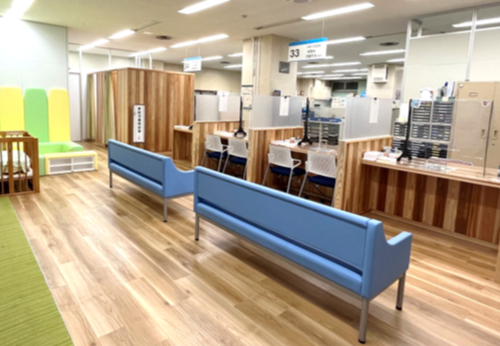 窓口カウンターには、区の脇山産木材などを使用しています。また、待合スペースでも木のぬくもりが感じられるよう、柱の周りにも木材を取り入れたデザインを施しました。