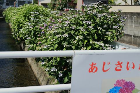 住宅街を流れる水路沿いに植えられたアジサイが綺麗に咲き始めています。