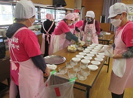 「つくって食べよう土曜昼!」は、野芥校区社会福祉協議会を中心に食進会や有志の方々が、地域や学校、企業、団体、行政等と連携して食事と居場所を提供、子どもを地域で支える環境整備に取り組もうというボランティア活動です。食材の手配、メニューの検討、調理などはもちろん、子ども達の心も満たそうという有志の方々の細やかな心遣いや手作業が光ります。