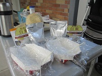 ・荷ほどきして一息入れ、昼食。お弁当のごみは環境に配慮し、班ごとに分別しました。