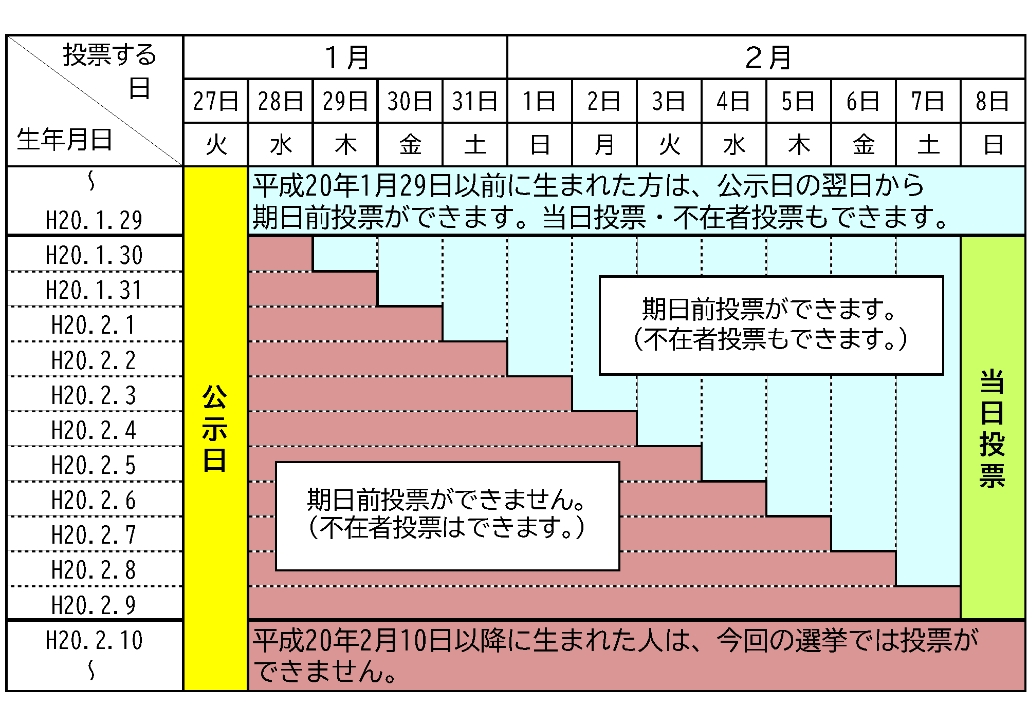 今回の選挙では、平成20年2月9日以前に生まれた人が投票でき、2月10日以降に生まれた人は投票できません。また、1月29日から2月8日までに生まれた人は、期日前投票ができる期間が生年月日により異なり、18歳を迎える誕生日の前日から投票できます。