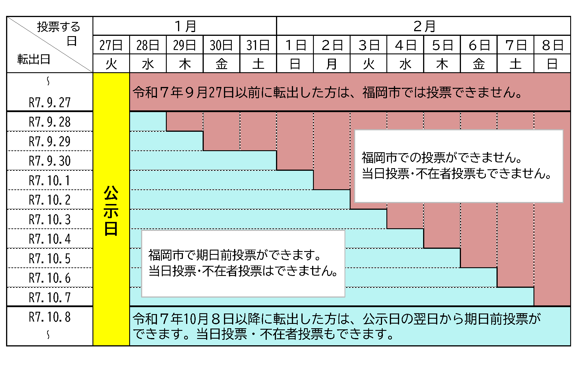 今回の選挙では、令和7年9月27日以前に福岡市外に転出した人は福岡市で投票できません。また、令和7年9月28日から10月7日までの間に転出した人は、当日投票、不在者投票はできませんが、期日前投票が福岡市でできる期間が転出日により異なります。