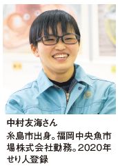 中村 水揚げされた魚を自分が売って、良いせりができた時に喜びを分かち合える、せりはやりがいのある仕事です。男女関係なく、一緒に働く仲間が増えるとうれしいです。