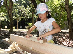 当日は大人、子ども併せて200人以上の参加があり、丸太切りやカンナ削り、左官塗りやパイプ配管など終日親子で工作体験を楽しんでもらいました。今年も8月19日の日曜に開催し多くの親子の歓声が公園・緑地に響いていました。今後もこの赤坂緑地・公園を舞台にし、子ども達が楽しめる様々なイベントを校区として実施していく予定です。