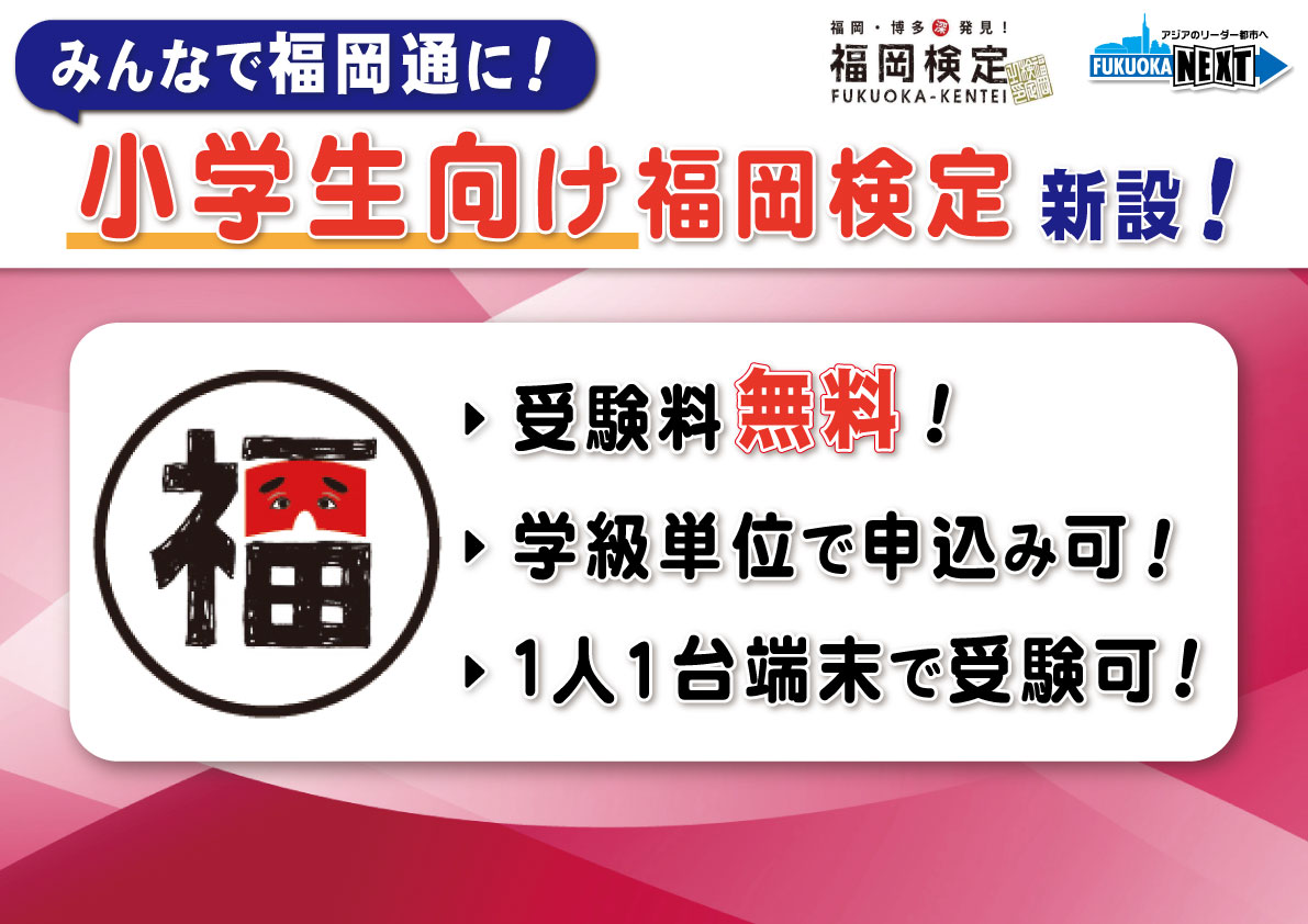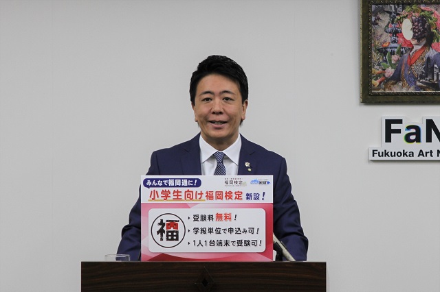 こうした部分をですね、ぜひ知っていただきたいということで、福岡検定というのはスタートしているわけですけども、実は、昨年度から学生の受験料を無料にしたんです。そうすると、学生の受験者数がすごく伸びたということもありまして、じゃあ、さらに拡大をして、これは小学生に福岡の歴史とか文化を楽しみながら学んでもらえるようにということで、新しく小学生向けの福岡検定を始めます。