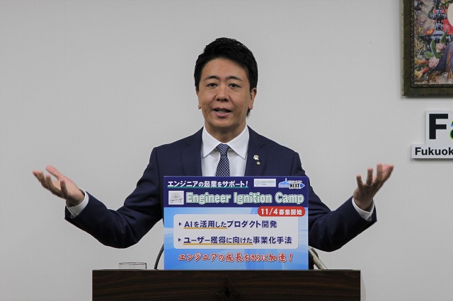 たくさんの人を集めて、たくさんの人が横に並んでプログラムをどんどんつくっていくっていうようなことではないかたちでの起業のかたちというふうに、今後やっぱり変わっていく。そうしたものに速やかに対応できるような支援体制というのが、一つは、この今回のEngineer Ignition Campだと思っていますので、そういった意味で、この、ぜひエンジニアの皆さんにも起業という部分、そして、ユーザー獲得をしながらビジネスを成長させていくというですね、こういったところを注入して、福岡から素晴らしいエンジニア起業家がね、たくさん生まれてくることを期待をします。