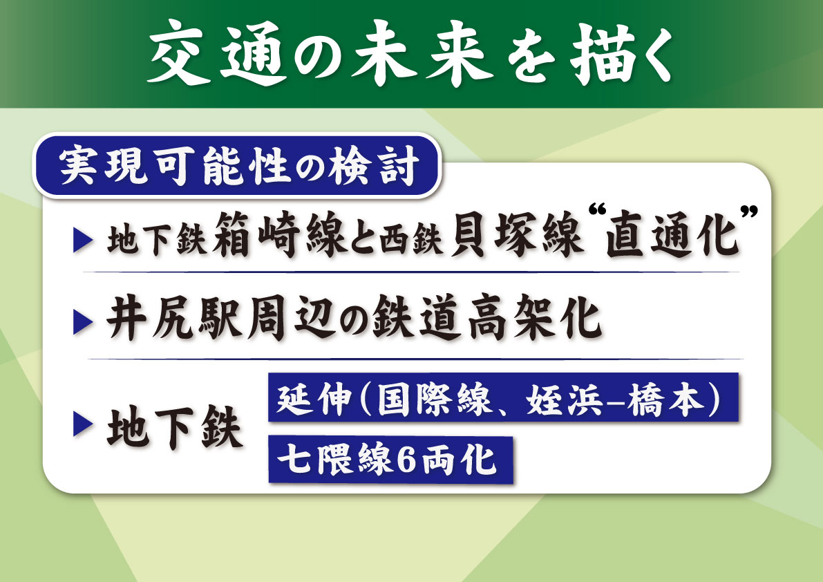 これ、市民生活にも密着に関係するんですけれども、交通の未来を考えるということで、去年、完成しました新たな交通マスタープランに基づきまして、箱崎線と西鉄貝塚線の直通運転化、それから、井尻駅周辺の連続立体交差、さらには地下鉄の国際線までの延伸、さらには姪浜・橋本間の接続・延伸、こういったものについての実現可能性を速やかに検討していきたいと思っております。【フリップ11】