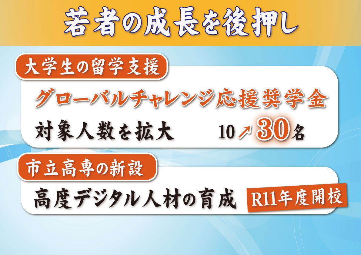 続いて、若い人のチャレンジを応援していきたいと思います。【フリップ12】特に、円安の状況の中、海外でチャレンジをすることって、ハードルが高くなっているんで、福岡市として新たに福岡市内の大学に在籍をする日本人大学生を対象にして、海外留学にかかる費用を奨学金として貸与します。ポイントはここからなんですが、留学から帰ってきたあと、福岡市ないしはもう福岡都市圏、ここで就職をしてくれたら返済しなくていいですよという、こういった奨学金、大幅に人数をですね、増やしていきたいと思います。