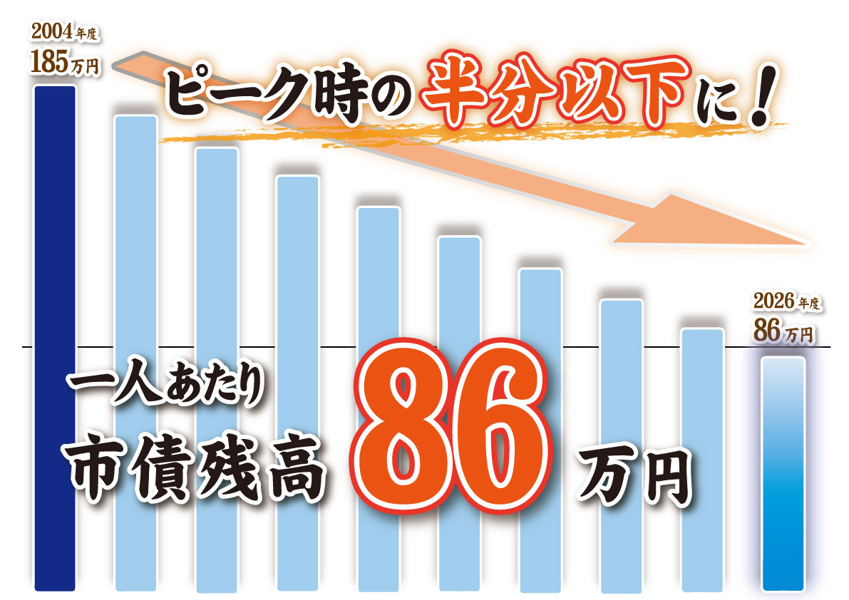 最後に、今こう、市債を減らしつつも、必要なところというか、メリットがある部分については発行するとあったと思うんですけども、今、86万円、一人当たりになりましたけど、どのぐらいの水準まで下がるのが適正というかですね、余地があると、今、見ていらっしゃいますか。