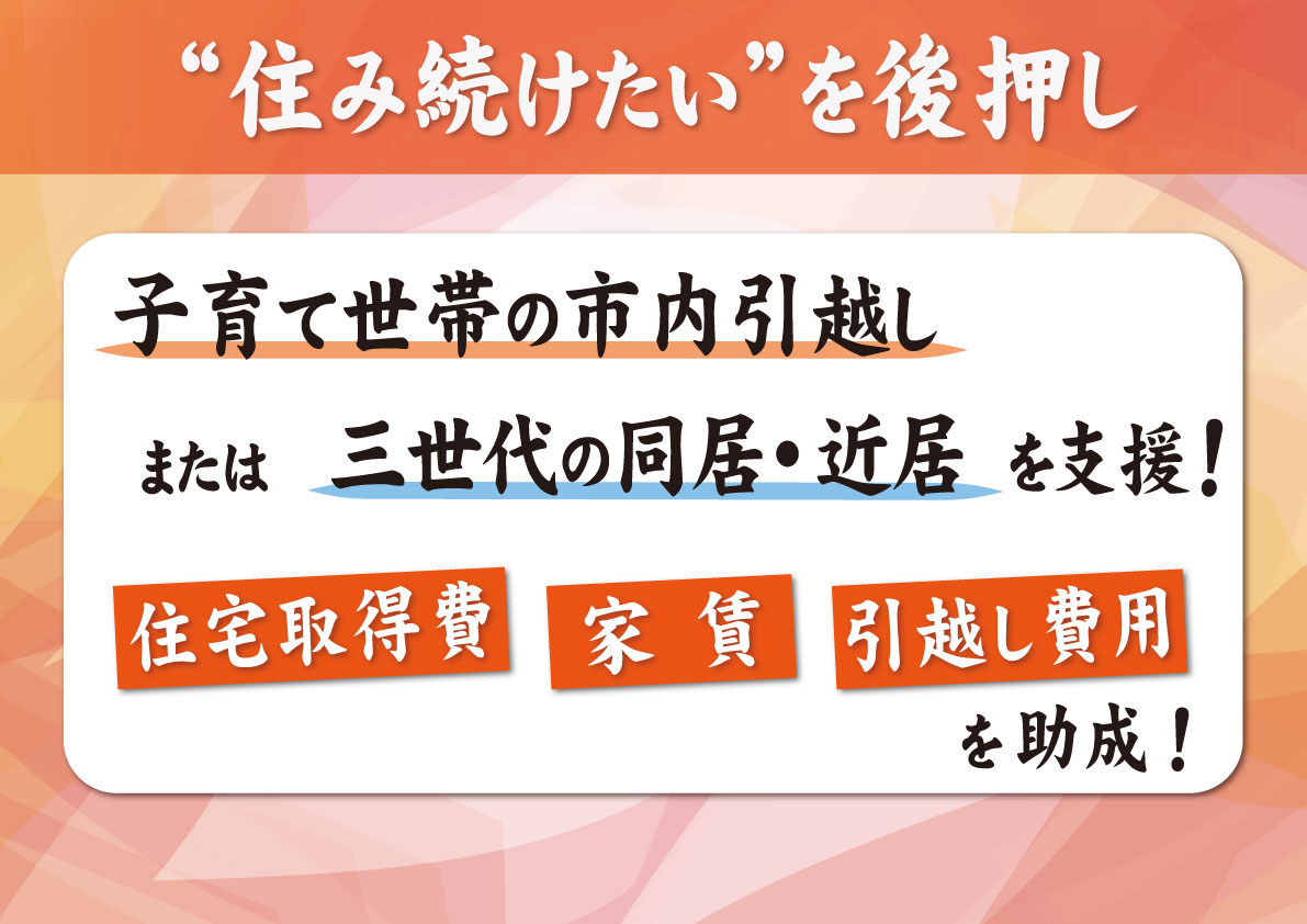 ということで、三世代の同居、また近居に伴う住み替えについても、新たに支援をいたします。つまり市内に住んでいる親世帯のもとに、子育て世帯が同居や近居のために住み替えるケースもあれば、その逆のケースもあるということですよね。助成額も最大125万円、さらにこれは市外からの住み替えも対象といたします。この事業は18歳までのお子さんや、もしくは妊娠している方がいる世帯を対象といたしますので、お引っ越しを検討されている方は、ぜひご活用いただきたいと思います。これは所得制限ないということになります。