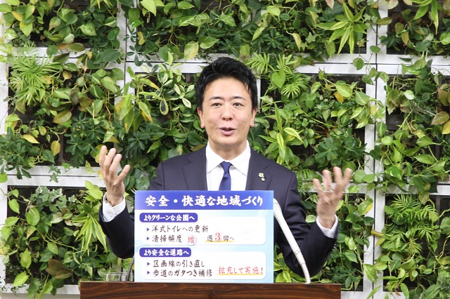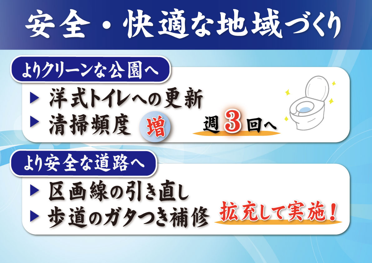 順番、これ行こう。こちら、はい。市民の皆さんの生活に身近な近くの公園のトイレの清掃の頻度を増やしたり、それから洋式化を一気に進めていったり、それから身近な道路の線をくっきり引いたりとか、ガタつきを直す。こういう市民生活に密着した部分の予算を大幅に、新年度増やしてございます。【フリップ7】