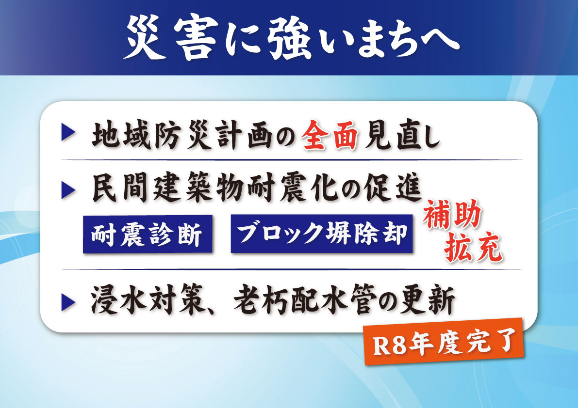 さらに、水道についても323キロに及ぶ老朽配水管の耐震管への更新というものが、新年度完了させたいと思っております。地震に強いまちづくりを着実に進めていきたいと思ってございます。